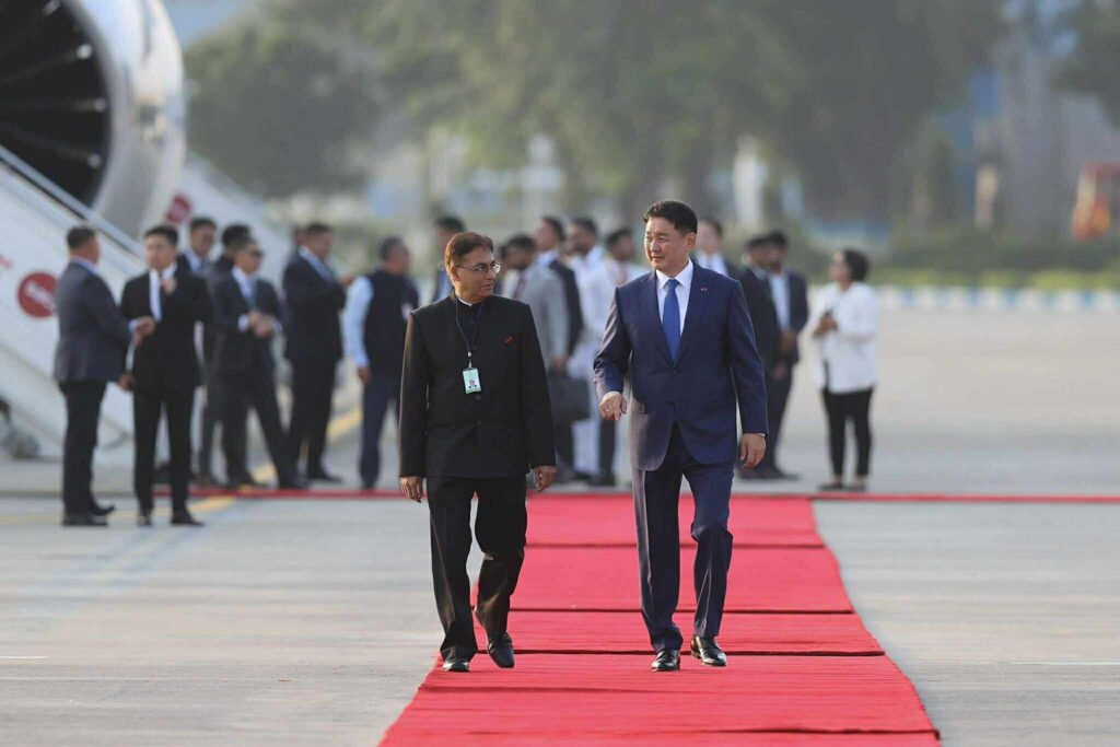 Ерөнхийлөгчийг Шинэ Дели хотын “Палам” нисэх онгоцны буудалд Энэтхэгийн Иргэний нисэх болон хамтын ажиллагааны яамны Төрийн сайд Мурлидхар Мохор, Монгол Улсаас БНЭУ-д суугаа Онц бөгөөд Бүрэн эрхт Элчин сайд Д.Ганболд нар хүндэтгэн угтав.