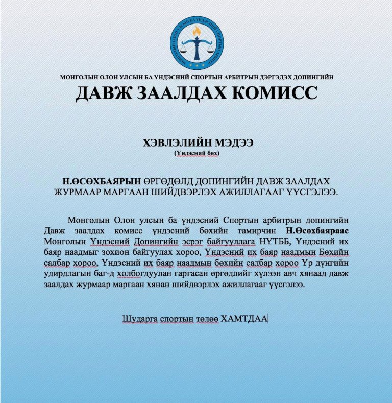 Улсын гарди Н.Өсөхбаяр допингийн шийдвэрийг эсэргүүцэж, Арбитрын шүүхэд хандлаа