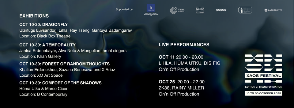 Байршлууд: Black Box Theatre, Хаан Галерей, XO Art Space, B Contemporary. Эдгээр үзэсгэлэнгүүд нь технологи, гэрэлтүүлэг, орон зайн сэтгэлгээ, дуу авиагаар дамжуулан шинэ туршлагыг үзэгчдэд хүргэх болно. Тэдгээр нь зөвхөн харах биш, мэдрэх, хувирах үйл явцыг илэрхийлэх платформ болж, орчин үеийн урлагийн шинэлэг талыг нээх юм.